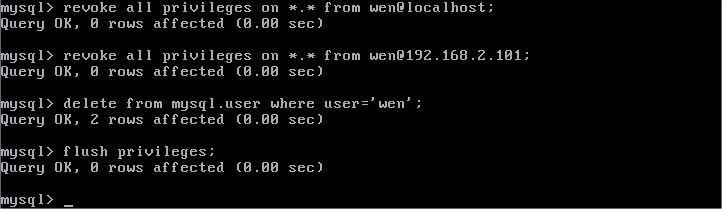 revoke all privileges on *.*from wen@localhost;//移除本機登入管理權限 revoke all privileges on *.*from wen@192.168.2.101;//移除遠端登入管理權限deletefrom mysql.user where user='wen';//刪除使用者 flush privileges;//更新資料庫權限